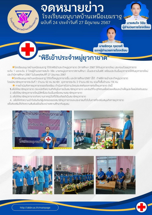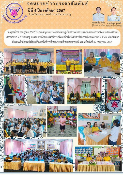 วันศุกร์ที่ 26 กรกฎาคม 2567 โรงเรียนอนุบาลบ้านเหนือเขมราฐเป็นสถานที่จัดการแข่งขันทักษะภาษาไทย ระดับเครือข่ายสถานศึกษา ที่ 17 เขมราฐ-นาแวง ตามโครงการรักษ์ภาษาไทย เนื่องในวันสัปดาห์วันภาษาไทยแห่งชาติ ปี 2567 เพื่อคัดเลือกตัวแทนเข้าสู่การแข่งขันระดับเขตพื้นที่การศึกษาประถมศึกษาอุบลราชธานี เขต 2 ในวันที่ 30 กรกฎาคม 2567