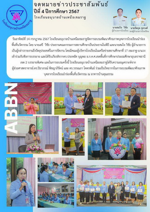 วันอาทิตย์ที่ 14 กรกฎาคม 2567 โรงเรียนอนุบาลบ้านเหนือเขมราฐจัดการอบรมพัฒนาศักยภาพบุคลากรโรงเรียนนำร่องพื้นที่นวัตกรรม โดย นายเสรี วิชัย ประธานคณะกรรมการสถานศึกษาเป็นประธานในพิธี และนายสมใจ วิชัย ผู้อำนวยการ เป็นผู้กล่าวรายงานถึงวัตถุประสงค์ในการจัดงาน โดยมีคณะผู้บริหารโรงเรียนในเครือข่ายสถานศึกษาที่ 17 เขมราฐ-นาแวง เข้าร่วมรับฟังการบรรยาย และได้รับเกียรติจากดร.ประหยัด บุญพอ อ.ก.ค.ศ.เขตพื้นที่การศึกษาประถมศึกษาอุบลราชธานีเขต 2 บรรยายพิเศษ และในการอบรมครั้งนี้ โรงเรียนอนุบาลบ้านเหนือเขมราฐได้รับความอนุเคราะห์จาก ผู้ช่วยศาสตราจารย์.ดร.ปิยาภรณ์ พิชญาภิรัตน์ และ ดร.วรรณภา โคตรพันธ์ ร่วมเป็นวิทยากรในการอบรมพัฒนาศักยภาพบุคลากรโรงเรียนนำร่องพื้นที่นวัตกรรม ณ อาคารบ้านคุณธรรม