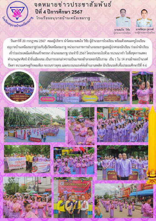 วันเสาร์ที่ 20 กรกฎาคม 2567 คณะผู้บริหาร นำโดยนายสมใจ วิชัย ผู้อำนวยการโรงเรียน พร้อมด้วยคณะครูโรงเรียนอนุบาลบ้านเหนือเขมราฐร่วมกับคุ้มวัดเหนือเขมราฐ หน่วยงานราชการอำเภอเขมราฐและผู้ปกครองนักเรียน ร่วมนำนักเรียนเข้าร่วมประเพณีแห่เทียนเข้าพรรษา อำเภอเขมราฐ ประจำปี 2567 โดยประกอบไปด้วย ขบวนนางรำ ในชื่อชุดการแสดง "ตำนานภูษาศิลป์ ผ้าถิ่นเมืองเขม" เป็นการบอกเล่าความเป็นมาของผ้าลายดอกไม้โบราณ เป็น 1 ใน 14 ลายผ้าของบ้านวงศ์ปัดสา ขบวนเศรษฐกิจพอเพียง ขบวนชาวพุทธ และขบวนรณรงค์ต่อต้านยาเสพติด นักเรียนระดับชั้นประถมศึกษาปีที่ 4-6