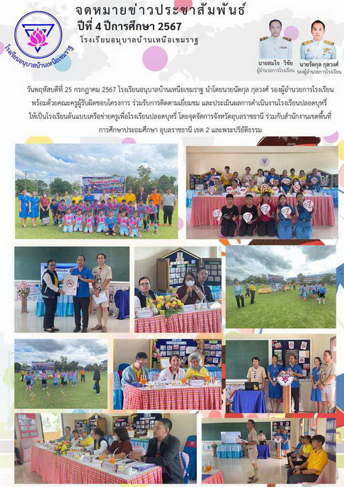 วันพฤหัสบดีที่ 25 กรกฎาคม 2567 โรงเรียนอนุบาลบ้านเหนือเขมราฐ นำโดยนายรัตกุล กุลวงศ์ รองผู้อำนวยการโรงเรียน พร้อมด้วยคณะครูผู้รับผิดชอบโครงการ ร่วมรับการติดตามเยี่ยมชม และประเมินผลการดำเนินงานโรงเรียนปลอดบุหรี่ ให้เป็นโรงเรียนต้นแบบเครือข่ายครูเพื่อโรงเรียนปลอดบุหรี่ โดยจุดจัดการจังหวัดอุบลราชธานี ร่วมกับสำนักงานเขตพื้นที่การศึกษาประถมศึกษา อุบลราชธานี เขต 2 และพระปริยัติธรรม