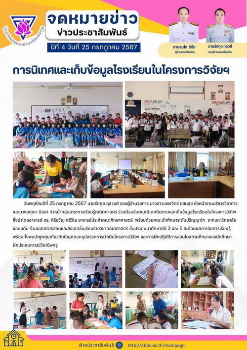 วันพฤหัสบดีที่ 25 กรกฎาคม 2567 นายรัตกุล กุลวงศ์ รองผู้อำนวยการ นางสาวแพงจิตร์ แสนสุข หัวหน้างานบริหารวิชาการ และนางสกุณา ปัสสา หัวหน้ากลุ่มสาระการเรียนรู้คณิตศาสตร์ ร่วมต้อนรับคณะนิเทศติดตามและเก็บข้อมูลโรงเรียนในโครงการวิจัยฯ