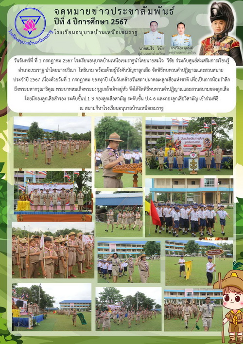 วันจันทร์ที่ ที่ 1 กรกฎาคม 2567 โรงเรียนอนุบาลบ้านเหนือเขมราฐนำโดยนายสมใจ วิชัย ร่วมกับศูนย์ส่งเสริมการเรียนรู้อำเภอเขมราฐ นำโดยนางปวิณา โพธินาม พร้อมด้วยผู้บังคับบัญชาลูกเสือ จัดพิธีทบทวนคำปฏิญาณและสวนสนาม ประจำปี 2567 เนื่องด้วยวันที่ 1 กรกฎาคม ของทุกปี เป็นวันคล้ายวันสถาปนาคณะลูกเสือแห่งชาติ เพื่อเป็นการน้อมรำลึกถึงพระมหากรุณาธิคุณ พระบาทสมเด็จพระมงกุฎเกล้าเจ้าอยู่หัว จึงได้จัดพิธีทบทวนคำปฏิญาณและสวนสนามของลูกเสือ โดยมีกองลูกเสือสำรอง ระดับชั้นป.1-3 กองลูกเสือสามัญ ระดับชั้น ป.4-6 และกองลูกเสือวิสามัญ เข้าร่วมพิธี